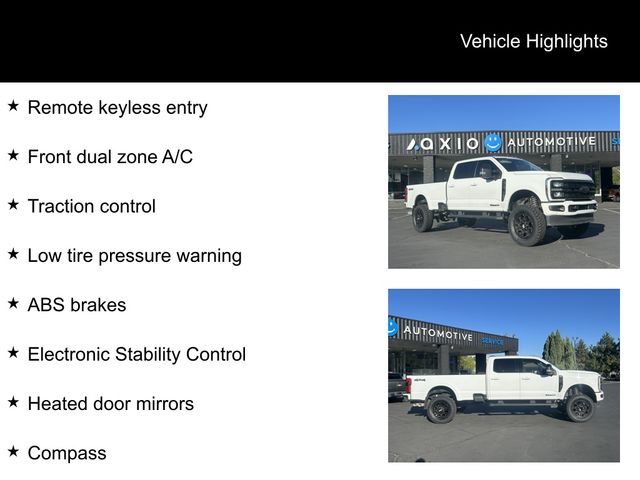 White 2024 Ford F-250SD Lariat 4WD 10-Speed Automatic Power Stroke 6.7L V8 DI 32V OHV Turbodiesel 4WD, ABS brakes, Alloy wheels, Compass, Electronic Stability Control, Front dual zone A/C, Heated door mirrors, Heated front seats, Heated rear seats, Illuminated entry, Low tire pressure warning, Remote keyless entry, Traction control.