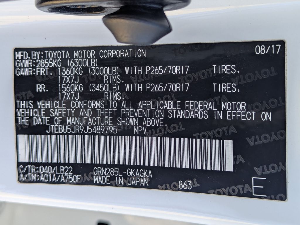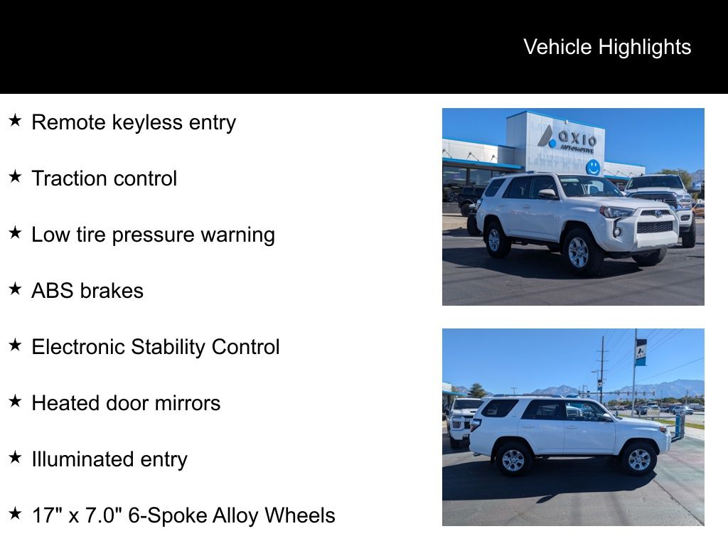 White 2018 Toyota 4Runner SR5 4WD 5-Speed Automatic with Overdrive 4.0L V6 SMPI DOHC 4WD, Black Graphite Cloth, 17" x 7.0" 6-Spoke Alloy Wheels, ABS brakes, Alloy wheels, Electronic Stability Control, Heated door mirrors, Illuminated entry, Low tire pressure warning, Remote keyless entry, Traction control.